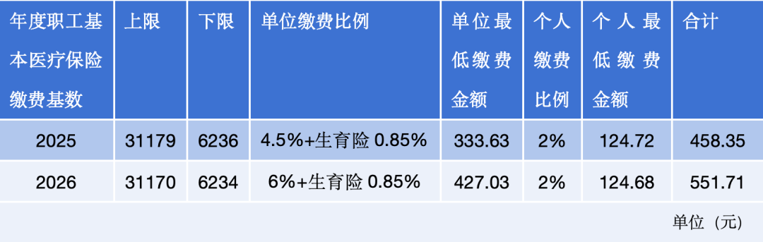 2️⃣按最低标准计算,单位医保月缴费约427.03元,比2025年多93.4元;个人医保月缴费约124.68元,几乎不变(少0.04元)。